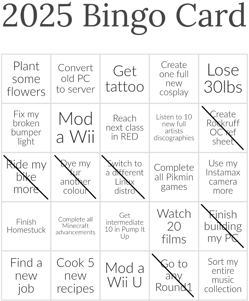 Every year, I try to make a bingo card and see how much I can complete. At the very least, I like to try to get a single bingo. Things didn't work out in my favour this year, however.