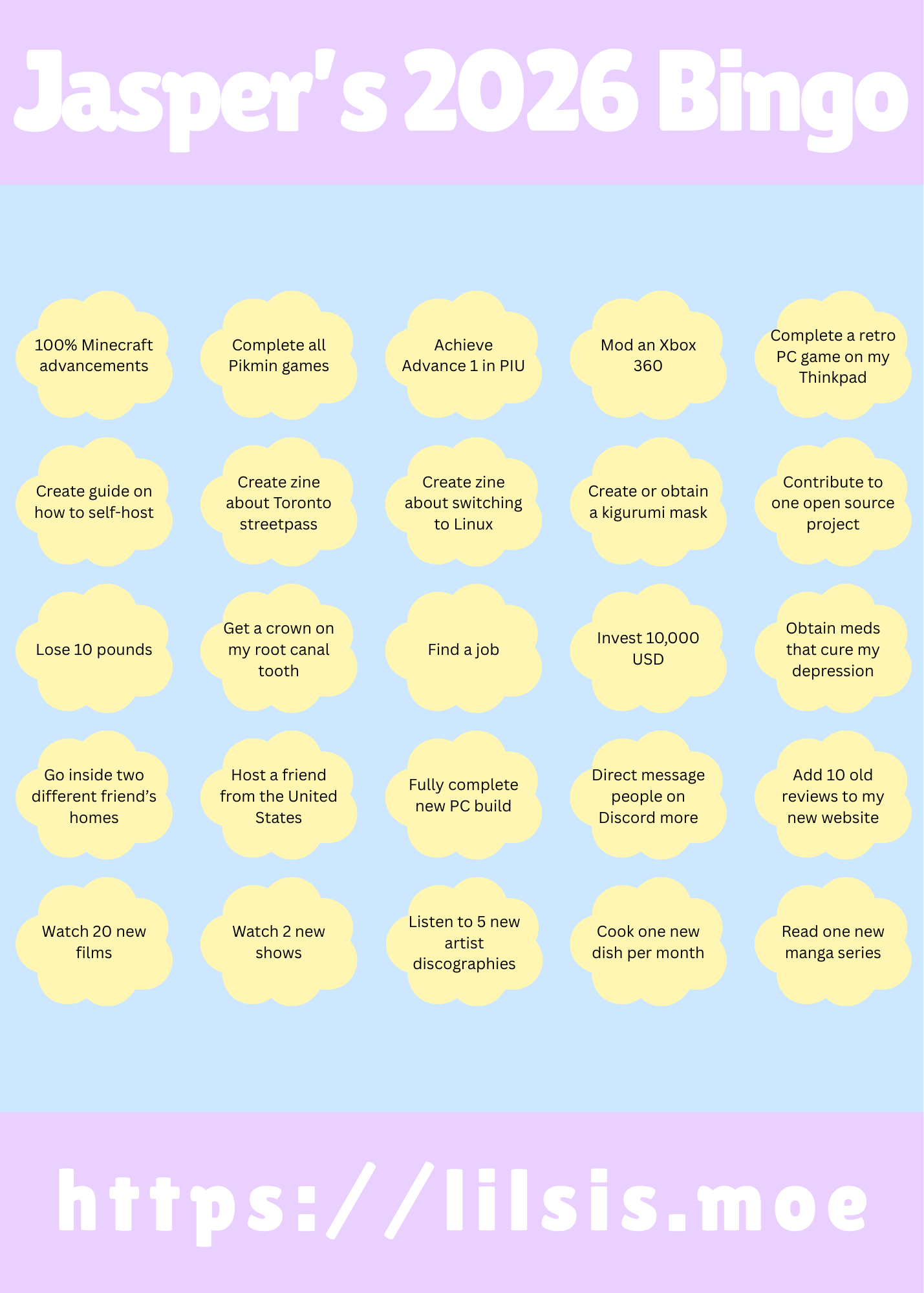 I made this bingo card design all on my own. :D Thanks for taking the time to read, and wish me luck in 2026!