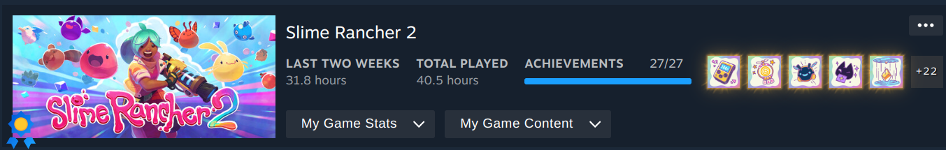 Usually, I have an “achievements that stand out” section, but there isn't any. They're all standard achievements, and none of them require you to do anything special or interesting. Should you complete Slime Rancher 2? That's a question of, should you play Slime Rancher 2 at all.